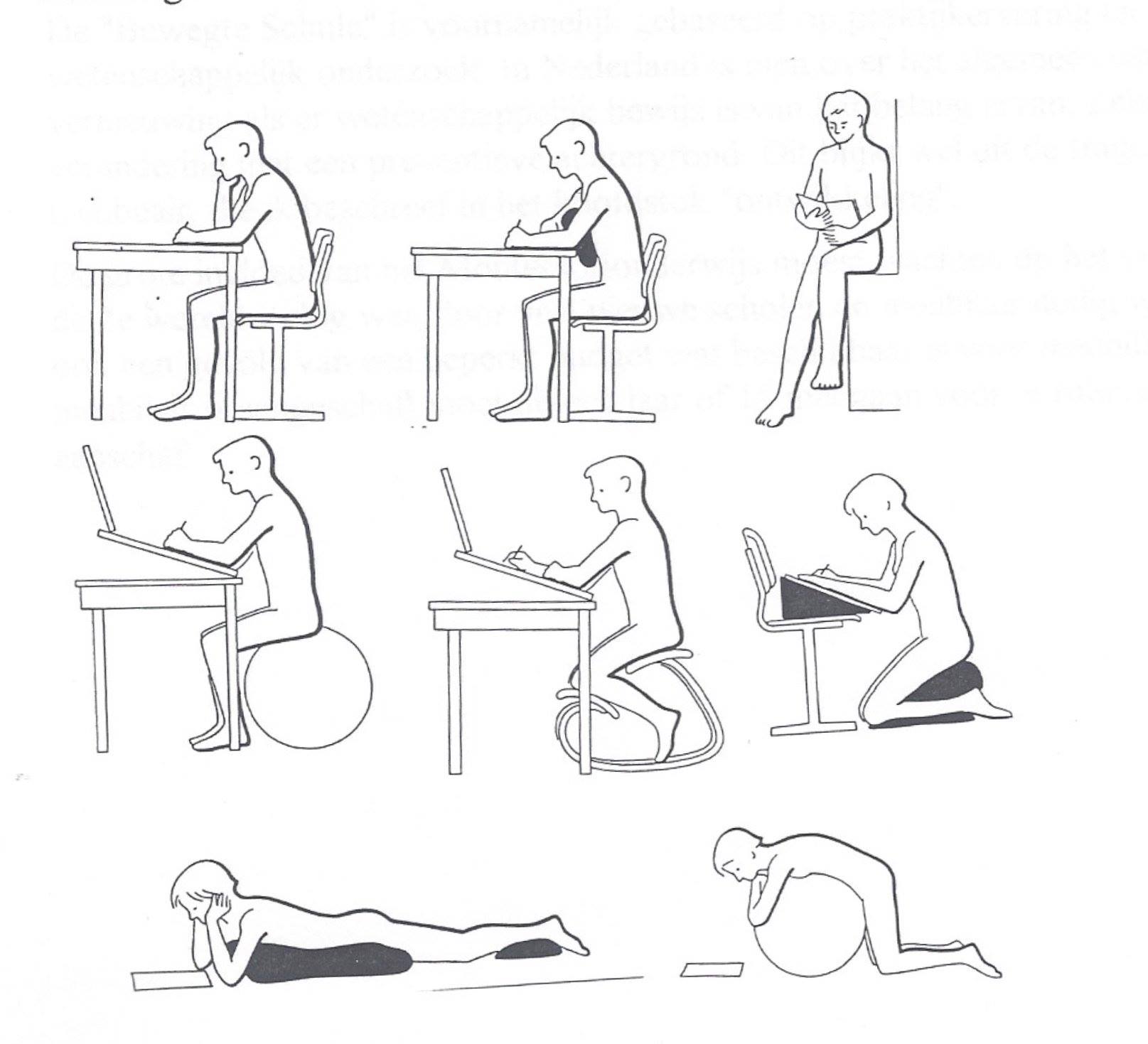 Het is erg belangrijk dat u goed op de houding van uw kind let. Zo is het erg belangrijk dat ze veel afwisselen. Veel kinderen zitten na school op hun mobiel, tablet of laptop en blijven daarbij te lang in een verkeerde houding zitten. Hieronder volgt een afbeelding met verschillende houdingen waarin ze kunnen afwisselen. Door op de afbeelding te klikken krijgt u een grote versie van de afbeelding.
