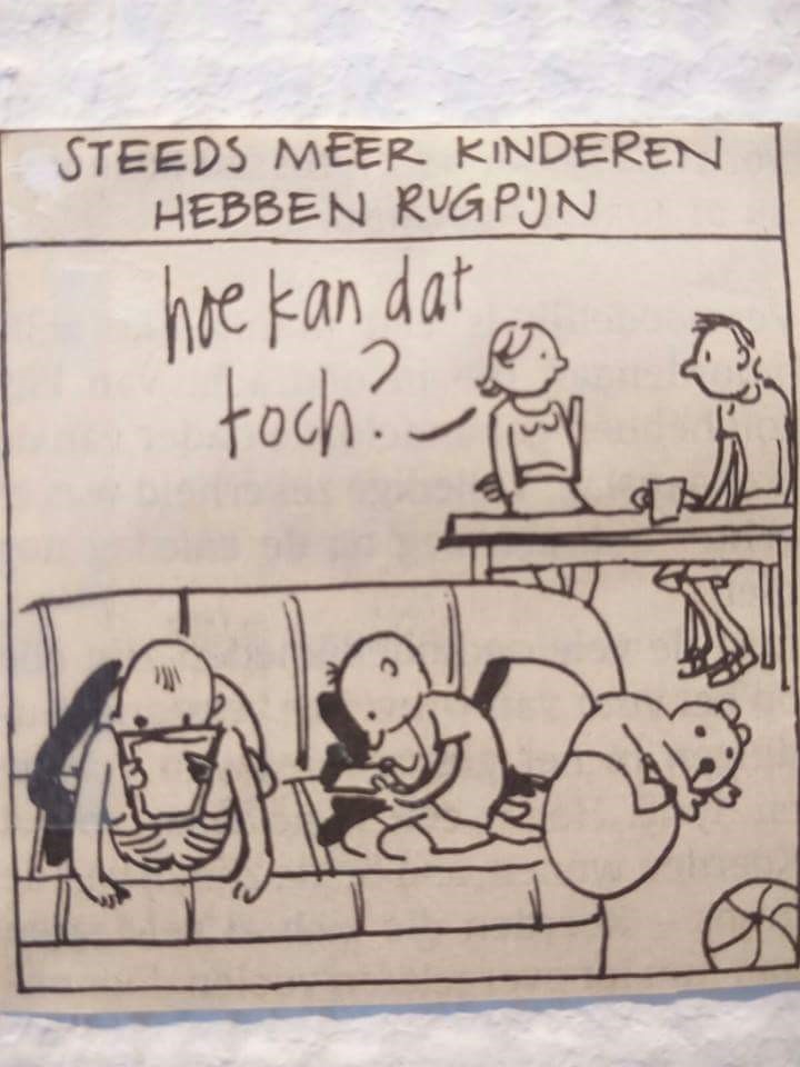 Je kunt het zien als een klein boompje dat moet groeien: als je de groei van het boompje blemmert door er een plankje boven te zetten, kan het boompje niet verder omhoog groeien. Maar het boompje zal echter wel doorgroeien. Hij zal daarom opzij gaan groeien. Het zelfde gebeurt met de wervelkolom van onze kinderen.